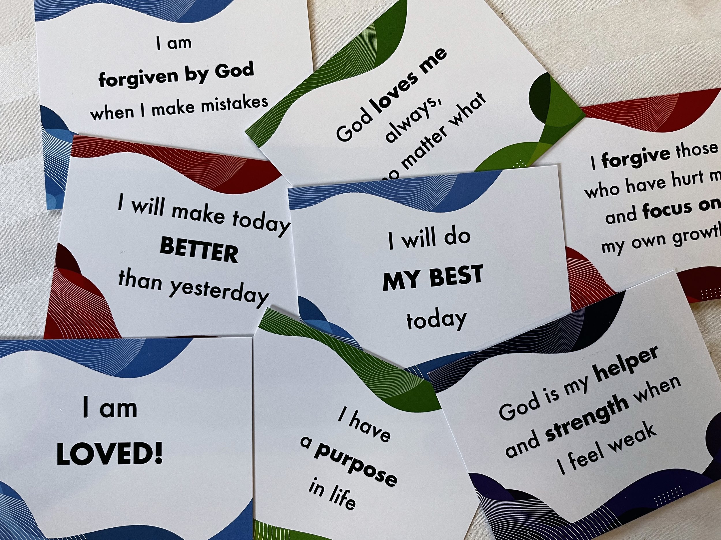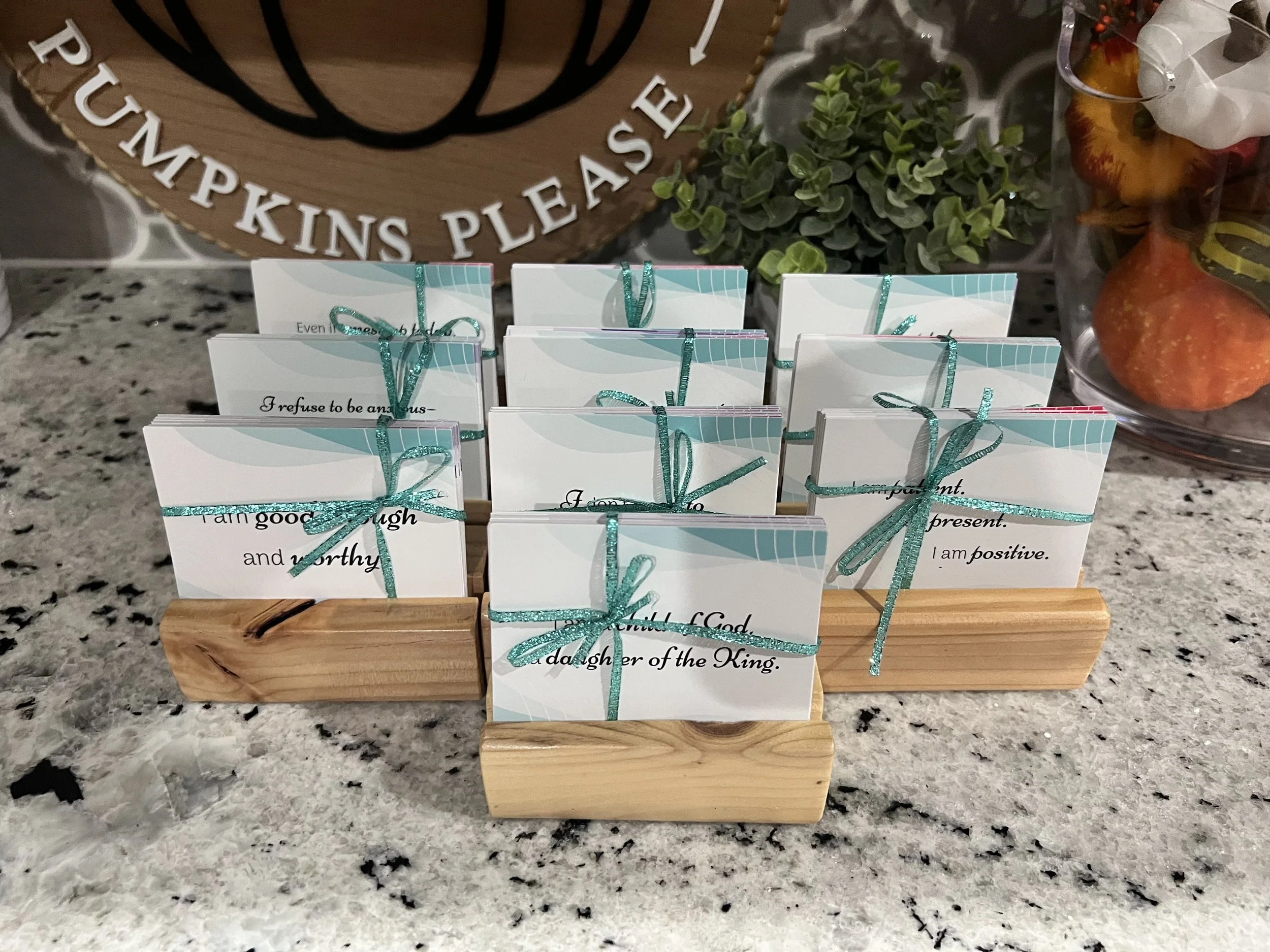 It all began with an idea to write down positive sayings for my husband to pick out of a jar each morning to start his day with a smile. As I was looking for different sayings and bible verses, I thought, not only does my husband need this but my friends and I do also! That’s where the women’s cards started. I designed them and got 10 sets printed to hand out to my Promise Principle bible study group. Those ladies encouraged me that I should print many of these and spread joy to as many people as possible. Then I designed the men’s cards, followed soon by the kid’s and teen’s which were also requests from friends. We quickly realized, these are amazing cards but hard to use or remember to use without a stand to hold them up in your bathroom, office, kitchen, etc. That’s when my husband came up with the beautiful handmade stands. Since then my husband, daughter and my parents have all worked really hard cutting, sanding and coating the stands that come with the sets of cards. It has been a huge blessing to my family to work together on something that God’s hand has been right in the middle of the whole time. I am in awe of how the Lord has unfolded this journey so far and am so excited to see how many people will be reached by these messages of love.